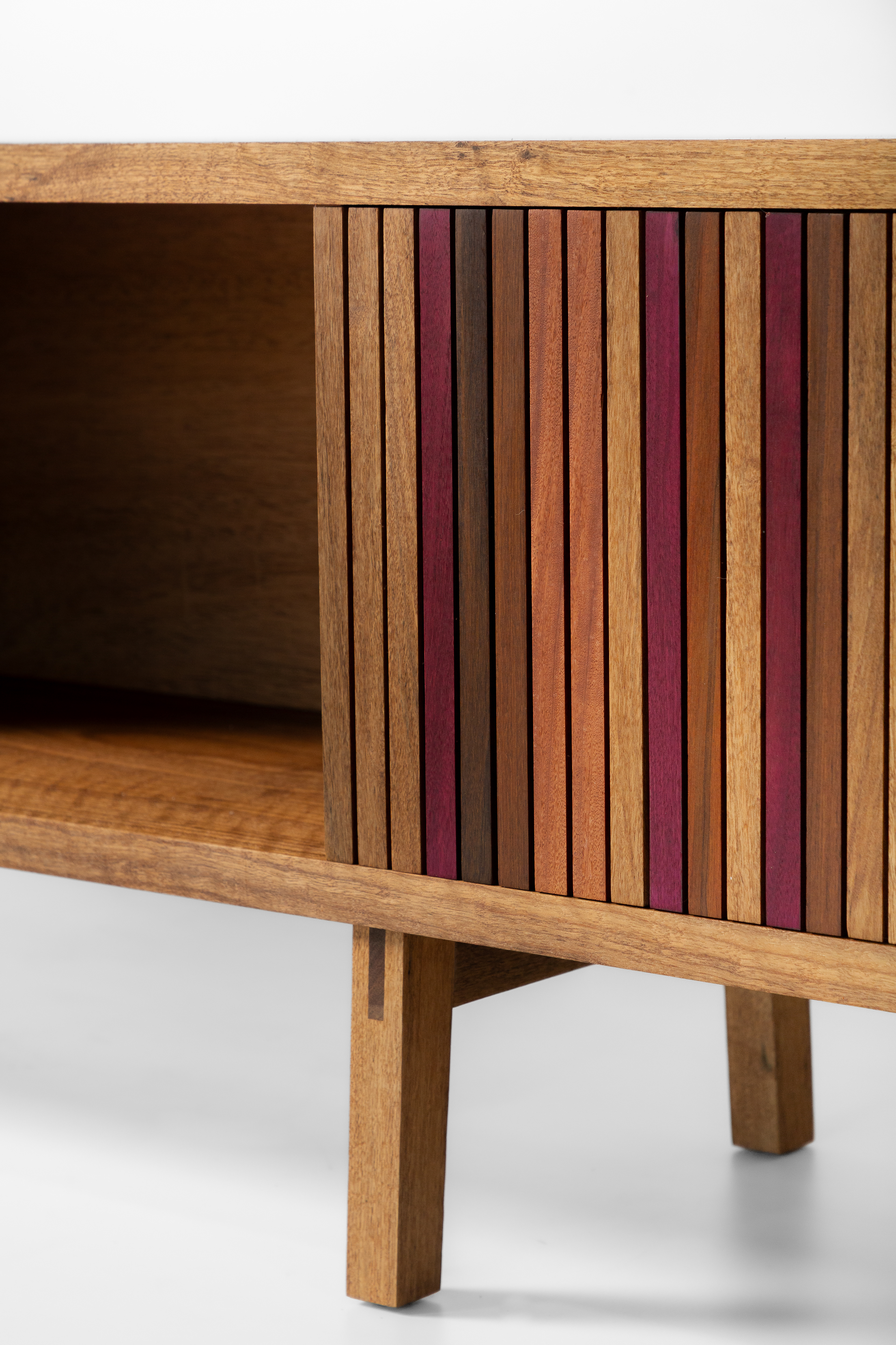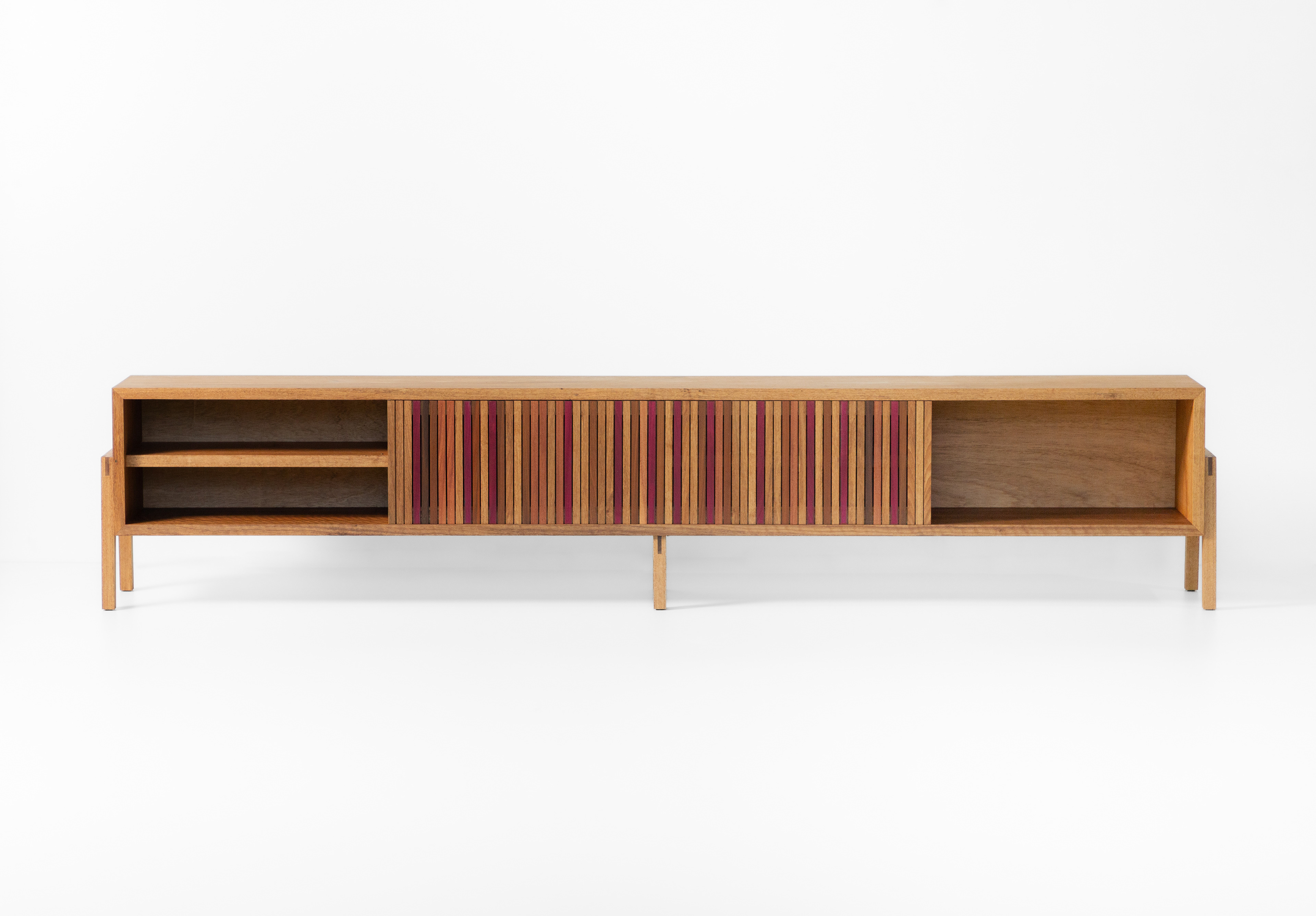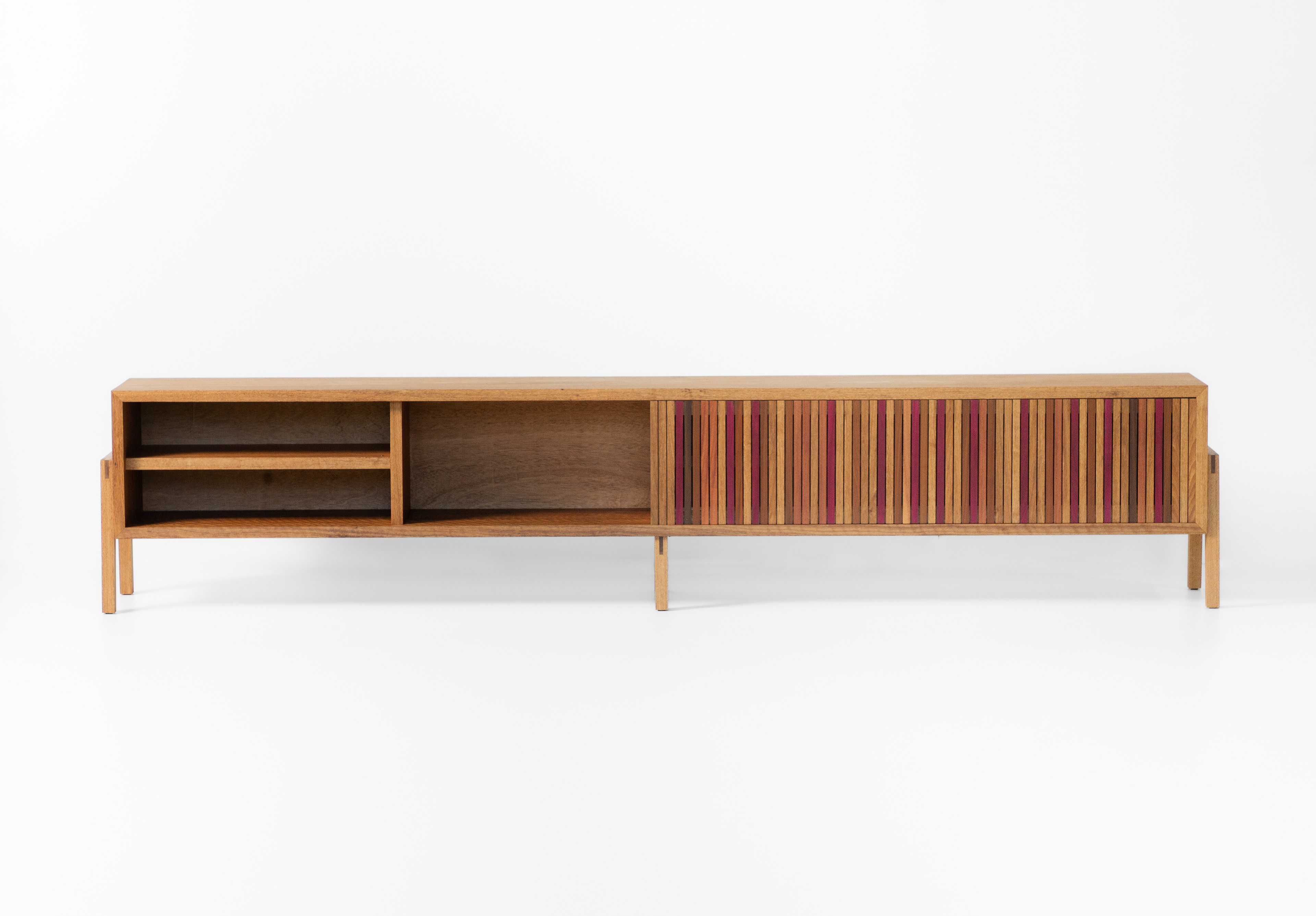 Design moderno e funcional. A estrutura e os encaixes aparentes dão uma bossa à peça. Os pés inclinados remetem ao design dos anos 50. A porta de correr facilita o dia a dia, as ripas de diferentes madeiras, fazem contraponto à estrutura maciça. A matéria-prima nobre e as técnicas de construção valorizam o desenho e aumenta a durabilidade do produto. Um móvel versátil e utilitário para diversos tipos de ambientes.