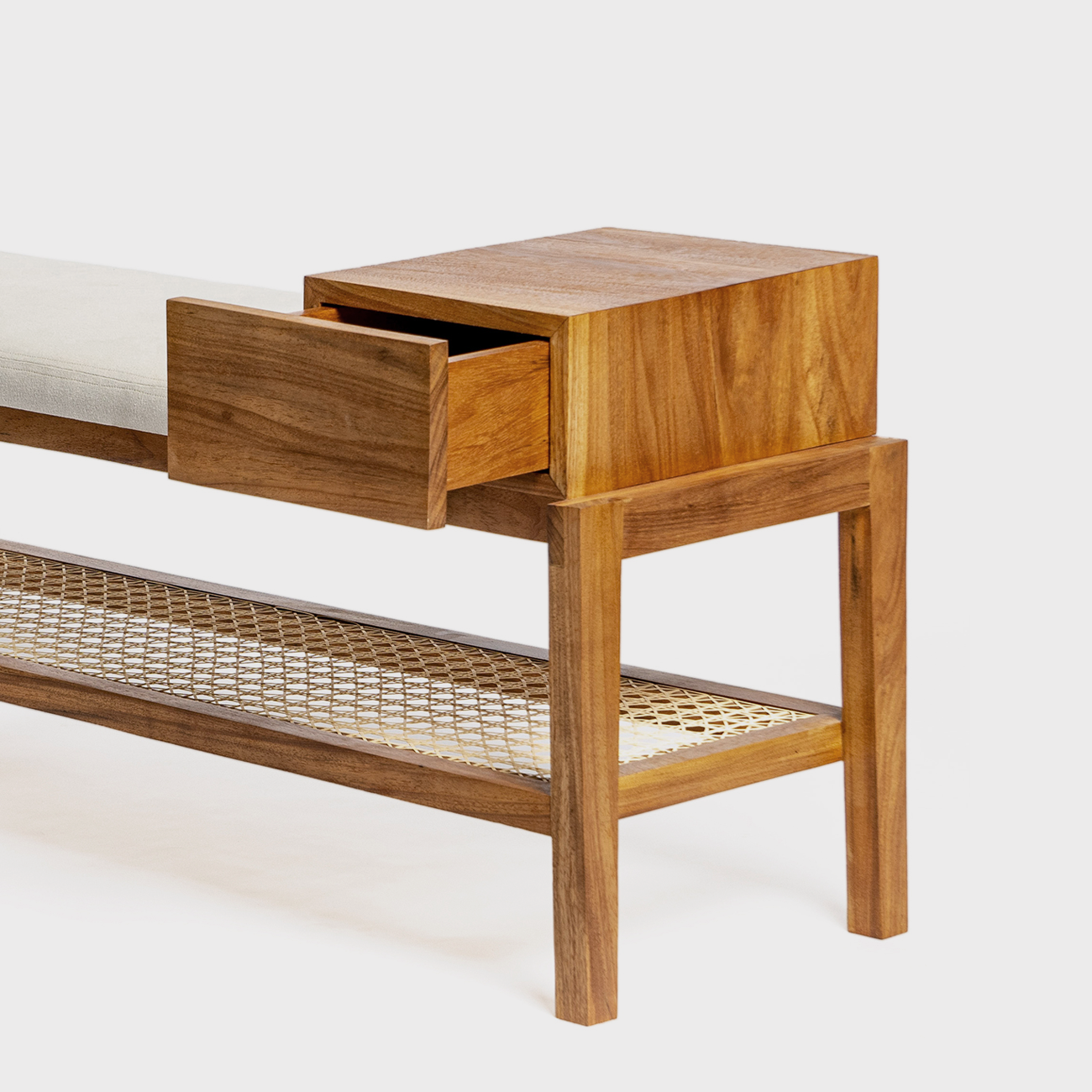 O banco sapateira Lissa é feito de madeira natural, lona de algodão extra macia, o trançado da tela da sapateira tem escala maior e é produzido com fibras naturais mais resistentes e duráveis. A gaveta pode guardar o álcool em gel, a máscara, chaves e outros pequenos objetos.