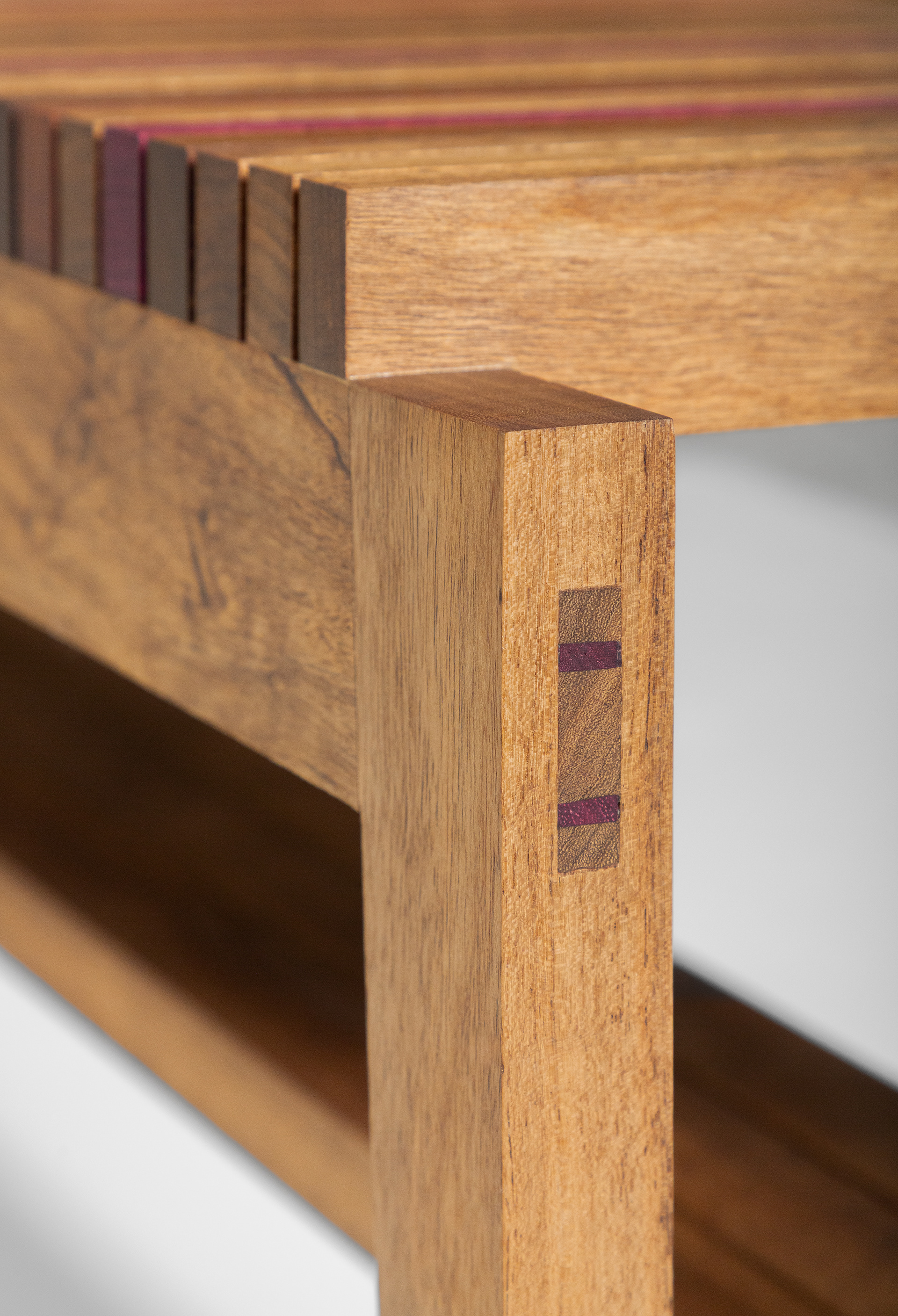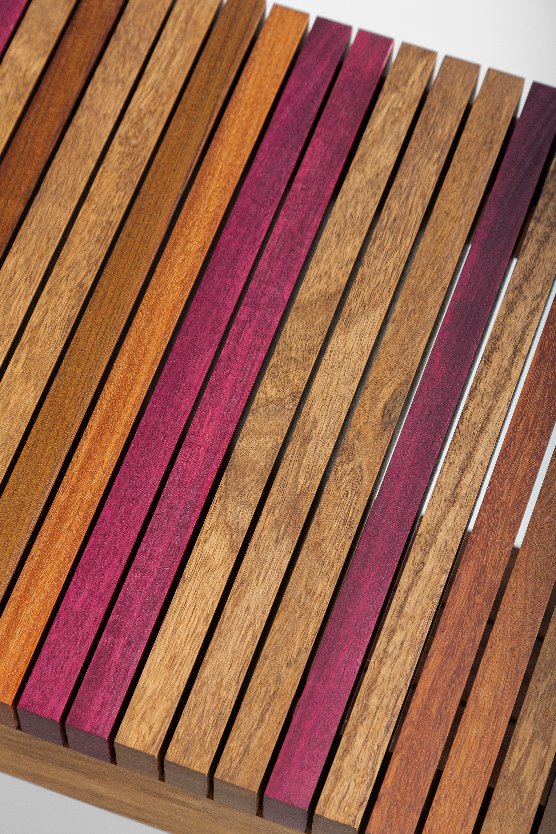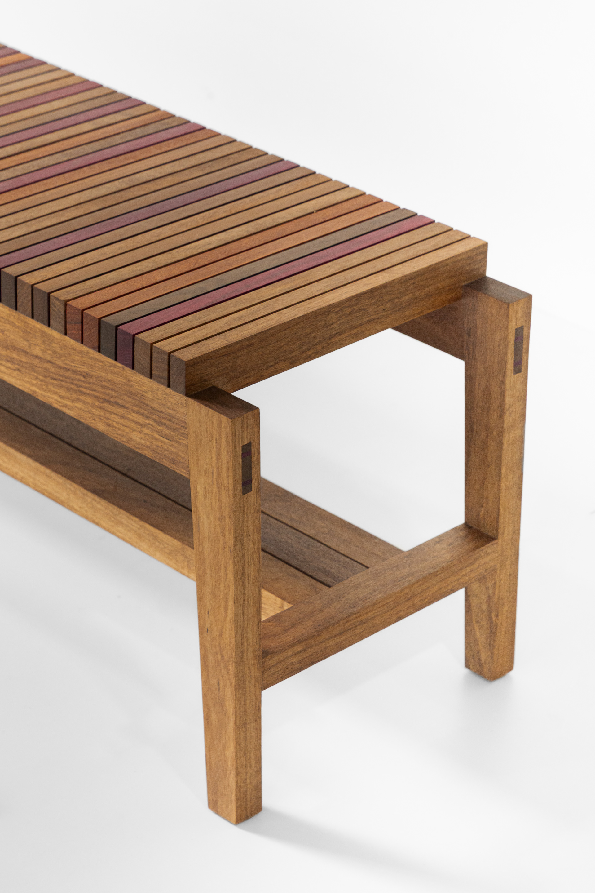 A matéria-prima nobre, as técnicas de construção e os encaixes aparentes valorizam o desenho e aumentam a durabilidade do produto. As ripas de diferentes madeiras dão ainda mais destaque à peça. A interação entre a estrutura e o assento, busca um diálogo presente entre a leveza e a funcionalidade.