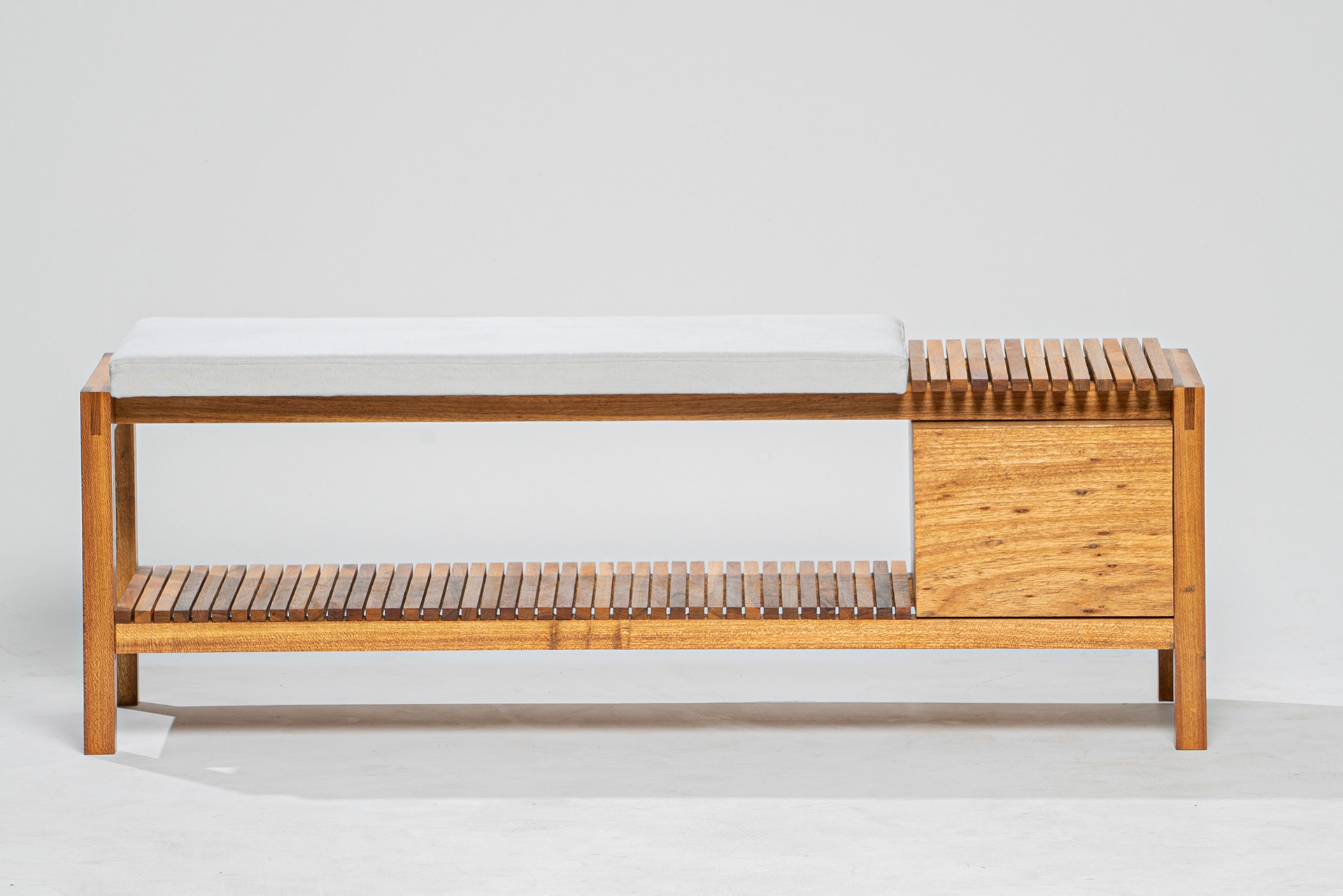Produzido com madeira natural, artesanalmente, a partir de encaixes. Tem o puxador esculpido na portinha do nicho, que pode guardar a carteira, as chaves e outros objetos. A prateleira ripada, pode ser utilizada como sapateira ou como apoio na decoração, a tapeçaria do assento é em lona de algodão extra macia.