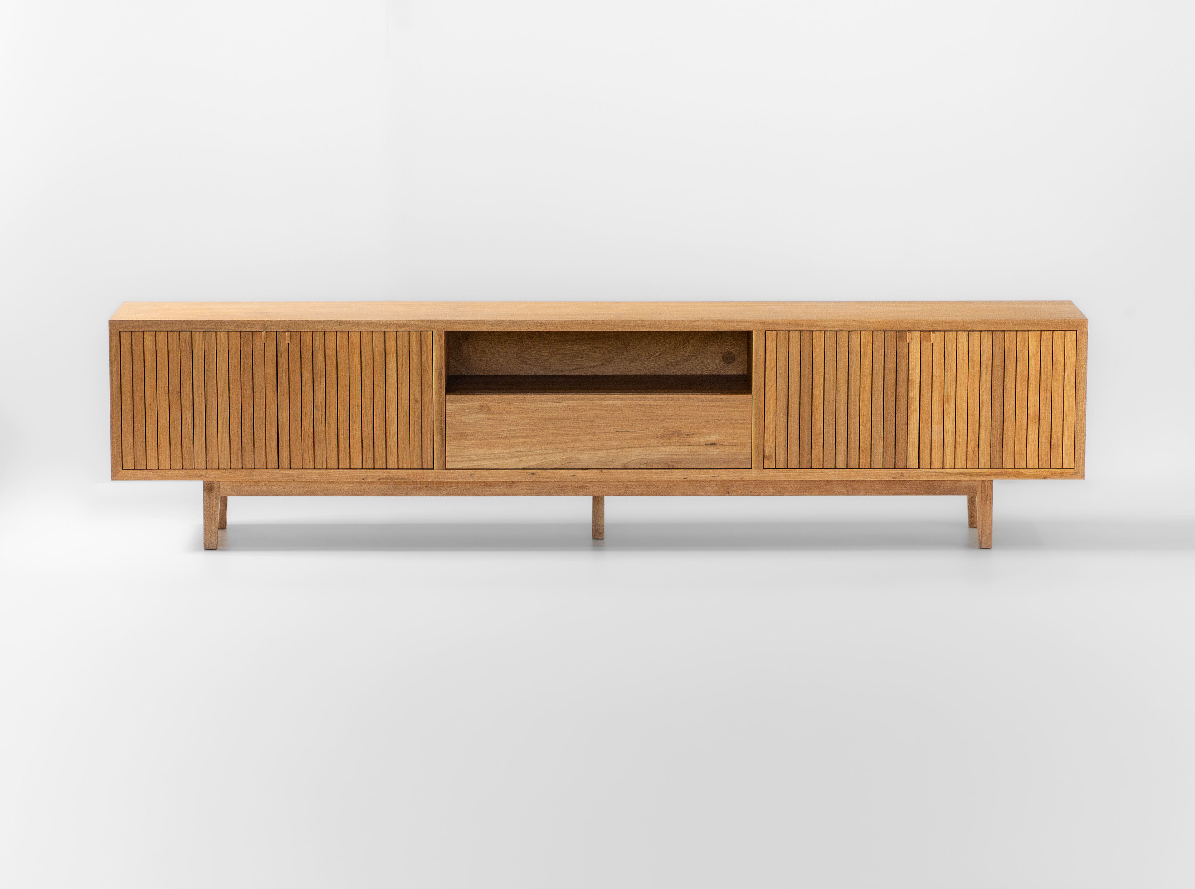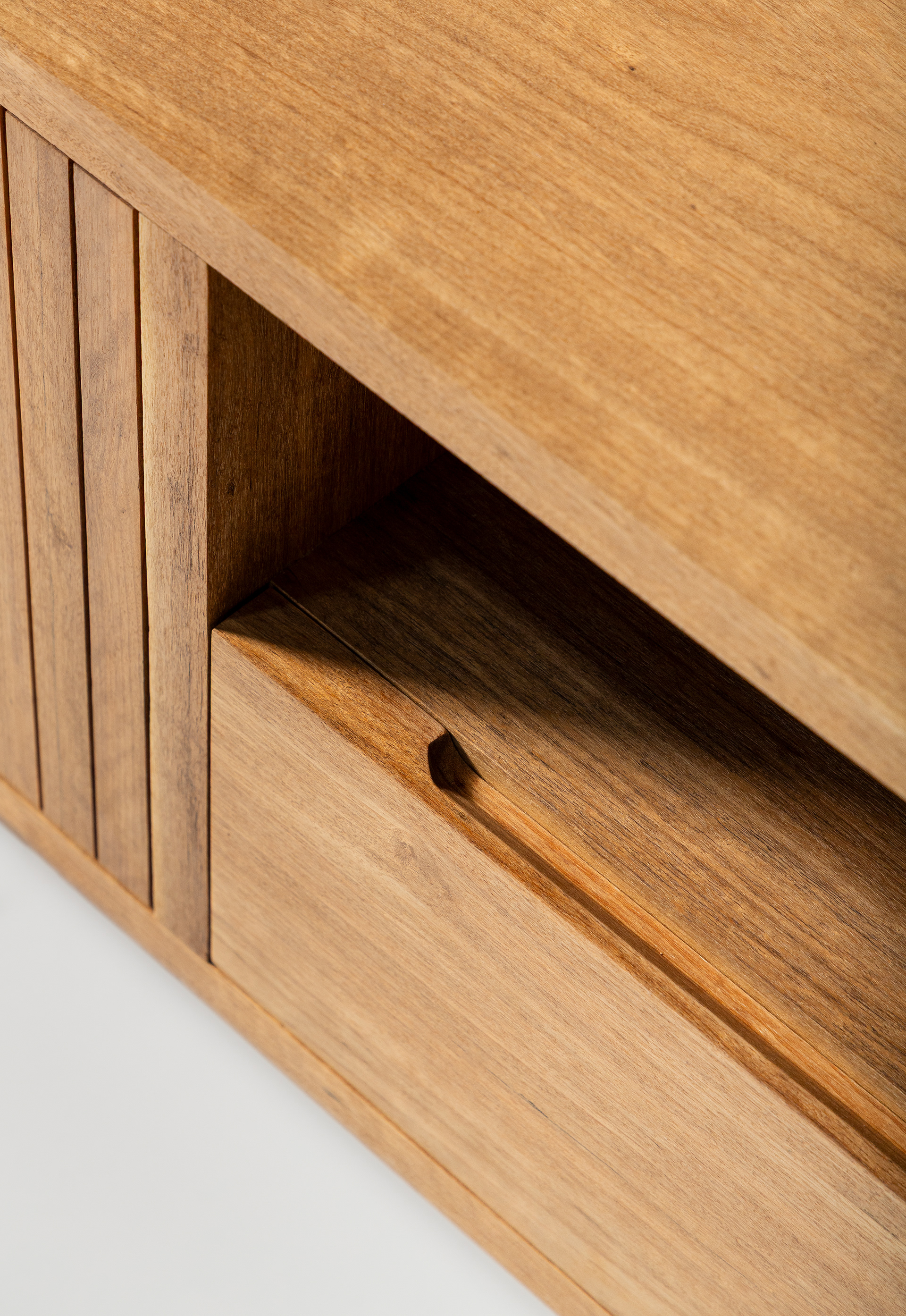 Design moderno e funcional. Feito todo em madeira maciça, tem dimensões generosas, um gavetão e nichos. Construído artesanalmente a partir de técnicas tradicionais, as portas são ripadas e possui pequenos e charmosos puxadores. Um móvel muito útil, com espaço para guardar tudo que desejar.
